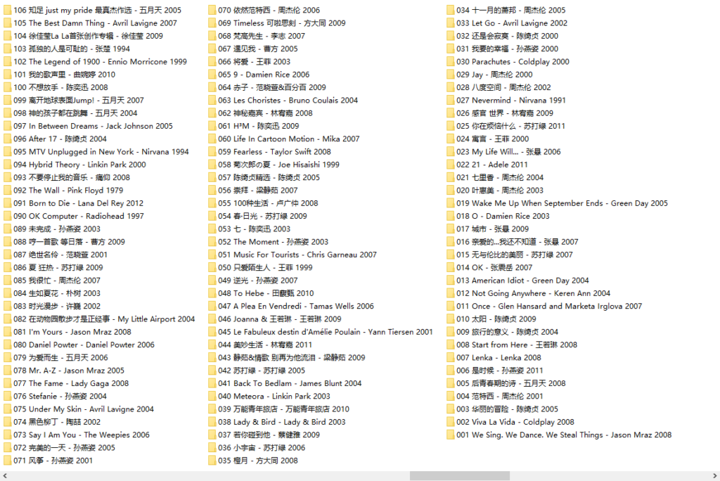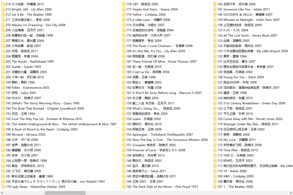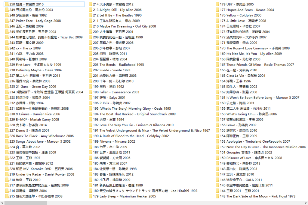 本资源收录了以上250张专辑2957首单曲,均为Flac无损音质,资源容量72GB。